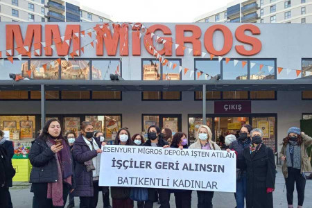 Batıkentli Kadınlar, Ergazi Mahallesi’nde bulunan Migros market önünde açıklama yaparak herkesi Migros Depo işçilerinin direnişine destek vermeye, Migros’u boykot etmeye çağırdı.
