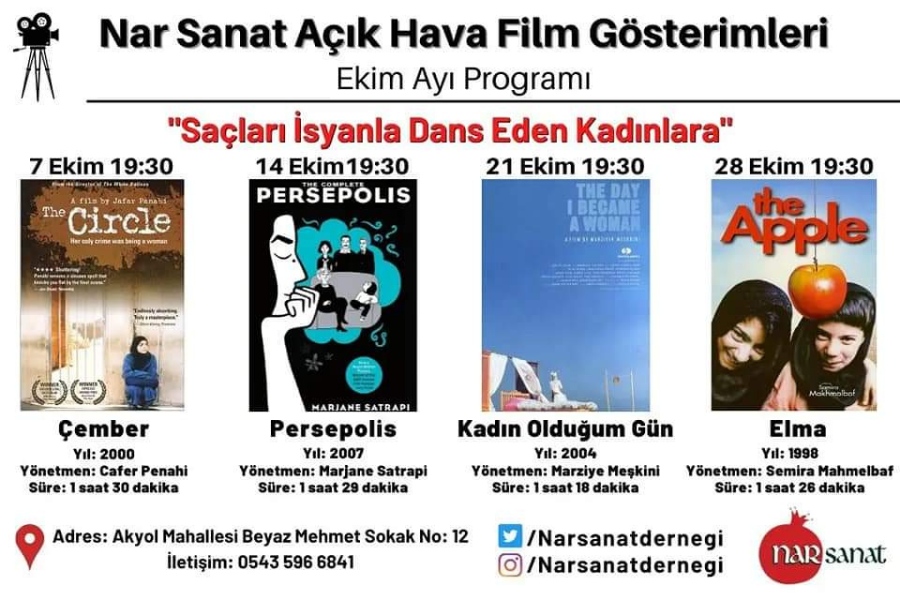 Nar Sanat Derneği, Ekim ayı açık hava film gösterimlerini İranlı kadınlara adadı. “Saçları İsyanla Dans Eden Kadınlara” sloganıyla duyurulan programın ilk filmi Cafer Penahi’nin Çember filmi oldu. Her cuma gerçekleşen film gösterimlerinin Ekim ayı içerisinde gösterimi yapılacak üç film ise Persepolis, Kadın Olduğum Gün ve Elma filmleri olacak. Nar Sanat Derneği sosyal medya hesaplarından yaptığı duyuruda, “Öldürülen, işkence gören, şiddete maruz bırakılan ve tüm baskılara rağmen günlerdir direnişlerini sürdürmeye devam eden İranlı kadınları selamlıyoruz” dedi.