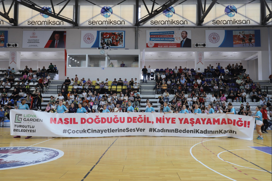 Lidya Garden City Turgutlu Belediyesi Kadın Basketbol Takımı, Kırklareli Belediyesi Kırklareli Fen Bilimleri karşısında oynadığı play-off 1. maçında “Nasıl doğduğu değil, niye yaşayamadığı” pankartıyla sahaya çıktı.