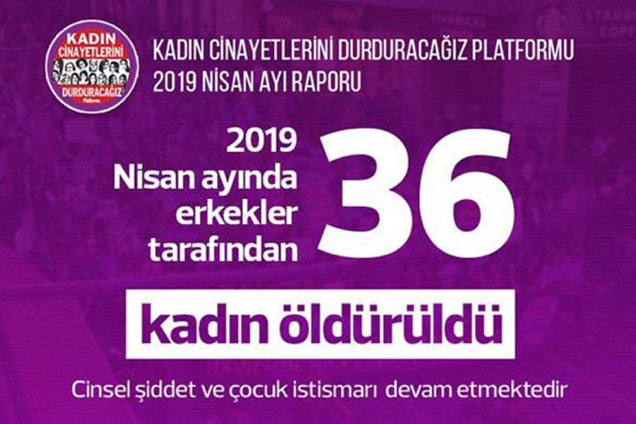 Kadın Cinayetleri Durduracağız Platformu’nun basına yansıyan haberlerden derlediği raporda Nisan ayında 36 kadının erkekler tarafından katledildiğini duyurdu.