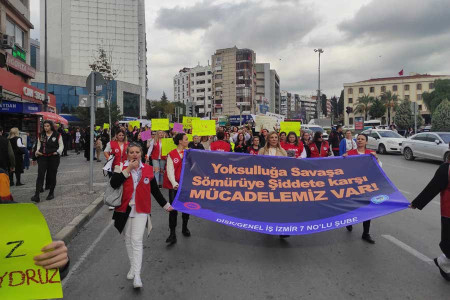 Genel-İş İzmir 7 No’lu Şube üyesi işçi kadınlar, 25 Kasım’a giderken yol kapattı, ‘yoksulluğa, savaşa, sömürüye karşı mücadelemiz var’ şiarıyla yürüyüş düzenledi.