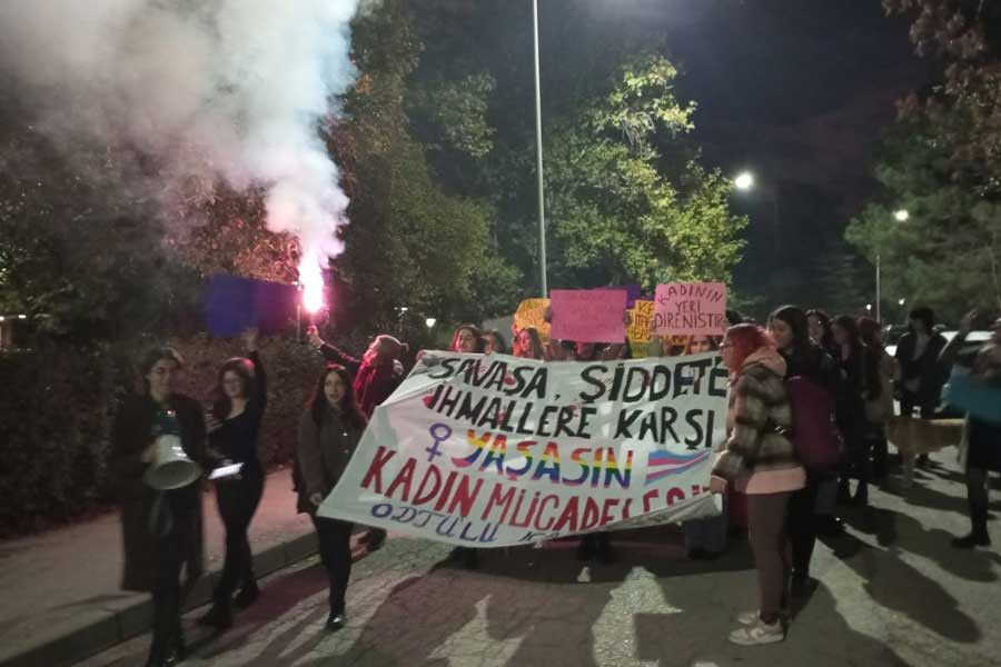 “Bir kişi daha eksilmeyeceğiz”, “Filistinli kadınlar yalnız değildir” sloganlarının atıldığı yürüyüşün ardından açıklama yapıldı. İktidarın seçimde ve sonrasında kadın düşmanı politikalara devam edeceğinin işaretini verdiği ifade edilen açıklamada şöyle denildi: “İktidar geçtiğimiz aylarda da milli manevi değerlerinin korunması adı altında düzenlediği büyük aile buluşmasında kadın ve LGBTİ+lara ne kadar düşmanca tutum sergilediğini tekrardan gösterdi. Bulunduğumuz her alanı bizler için güvensiz hale getiren bu politikalar, kampüslerimizde, yurtlarımızda da karşılık buluyor. Barınma krizinin arasından sıyrılıp bir yurda yerleşenlerimiz insancıl olmayan yurt koşullarına mahkum oluyor, iktidarın ihmalkarlığı sonucu tamir edilmeyen asansörlerde öldürülüyoruz, bütçe ayrılmayan yemekhanelerde yediğimiz yemekler sonucu zehirleniyoruz. Trans kadınların yurtlarda barınamaması ve senelerdir erkek yurtlarında uygulanmayıp kadın yurtlarında uygulanan kurallar, imzaladığımız savunmalar ve geç geldiğimizde sorulan hesaplar, son zamanlarda değiştirilen turnike sistemleri yaşamlarımızı her geçen gün zorlaştırıyor. Ayrımcılık akademide de devam ediyor. Atanmış rektörün bütçe bahanesiyle güvenli ulaşımı bize sağlamaması, biz kadınları otostop ve taksi gibi tacize ve şiddete açık seçeneklere mecbur bırakıyor. Güvenli kampüs için bir adım olan kampüs ışıklandırılması yapılmıyor, karanlık yollara mahkum oluyoruz. Tüm bu yaşadıklarımızın karşısında başvurabileceğimiz, mücadelemiz sonucunda kurulan Cinsel Tacizi Önleme Birimi’ne (CiTÖB) bütçe ayrılmaması, yeteri kadar tanıtılmaması ve profesyonel bir ekibi içinde barındırmaması ile işlevsizleştirilmeye çalışılıyor.”