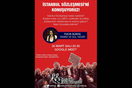 ODTÜ İİBF Emek Gençliği Fulya Alikoç'un katılımıyla İstanbul Sözleşmesi'ni, Sözleşme'den çekilme kararını ve mücadele yöntemlerini tartışacakları online buluşmaya çağrı yapıyor.