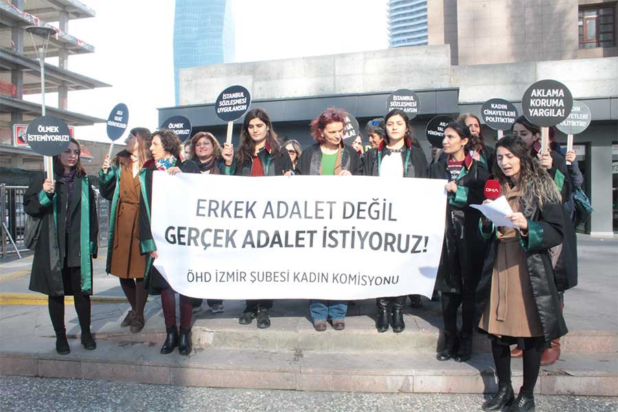 Özgürlük için Hukukçular Derneği (ÖHD) İzmir Kadın Komisyonu “Bende kadınım bana niye tecavüz etmiyorlar” diyen Ankara Cumhuriyet Savcısı Yeter Gümüş’ü protesto edip HSK’ye şikayet dilekçesi vermek için İzmir Adliyesi önünde basın açıklaması gerçekleştirdi. “Erkek adalet değil, gerçek adalet istiyoruz” yazılı pankart açan avukatlar, “Yaşasın kadın dayanışması” ve “İstanbul Sözleşmesi uygulansın” sloganları attı.