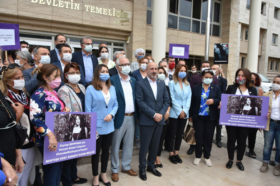 Zeynep Şenpınar davası öncesi Muğla Kadın Platformu ve Üniversiteli Genç Kadınlar Sınırsızlık Meydanı’nda basın açıklaması gerçekleştirildi. Açıklamaya Zeynep’in ailesi, çeşitli kadın örgütleri, HDP ve CHP İl yönetim üyeleri ve Muğla Baro Başkanı Cumhur Uzun da katıldı. Açıklamayı Leyla Kalın okudu. Kadınlar sık sık “Erkek adalet değil gerçek adalet”, “İstanbul Sözleşmesi yaşatır”, “Sözleşmeyi uygula kadını yaşat”, “Erkek vuruyor devlet koruyor” “Kadınları değil katilleri yargıla” sloganları attı.
