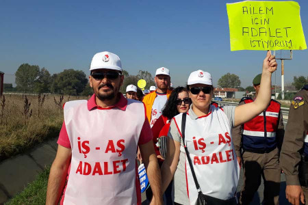 Cam işçileri ve aileleri talepleri için Lüleburgaz'dan Tuzla'daki Şişecam Genel Merkezine yürüyor. İşçiler “iş, aş, adalet” istiyor, herkesi dayanışmaya çağırıyor.