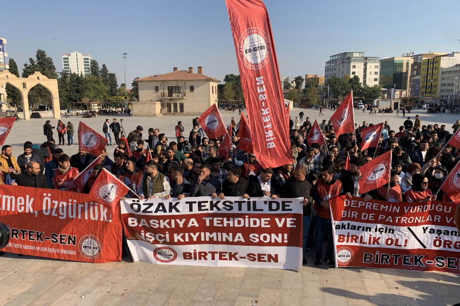 Urfa'da işten atmalara, mobbinge, tehditlere ve kölelik düzenine karşı Birleşik Tekstil Dokuma ve Deri İşçileri Sendikasında (BİRTEK-SEN) örgütlenen ve haklarını almak için 7 gündür direnişte olan Özak Tekstil işçilerinin bugün kent merkezinde yapacağı yürüyüş, polis tarafından engellendi. Polisin işçilerin önüne barikat kurması ve yürümelerine izin vermemesi sonucu işçiler Topçu Meydanı'nda basın açıklaması yapma kararı aldı. Basın açıklaması sırasında sık sık "Öz İplik dışarı, BİRTEK-SEN içeri", "Özak'ta direniş kadınlarla büyüyor", "İşçi, patronun kölesi değil", "Emek bizim, söz bizim", "Direne direne kazanacağız", "İşçi işçiye ihanet etmez" ve "Kurtuluş yok tek başına, ya hep beraber ya hiçbirimiz" sloganları atıldı.