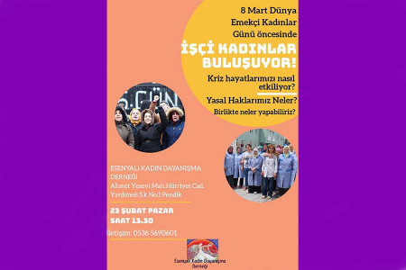 Esenyalı Kadın Dayanışma Derneği çağrısıyla işçi kadınlar bir araya gelerek 8 Mart öncesi sorunlarını ve taleplerini konuşacaklar.