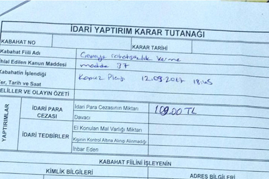 “Biz de kadın olduğumuz için yapılması gerektiğini düşündüğü uygulamadan imtina etmemesini söyledik. Şefi olduğunu söyleyen kişiyi çağırdı. Aynı şekilde sahilin belediyeye ait olduğunu ve sahilde içki içmenin yasak olduğunu söyledi. Biz de böyle bir yasağın hukuki olmadığını, plajın herkese ait olduğunu söyledik. Bu görevliler tarafından 155 arandı. Polis geldiğinde denizdeydim. İsmim anons edildi. Sahilde polisler tarafından arkadaşımla beraber hakkımızda çevreyi rahatsız etmekten ihbar olduğu gerekçesiyle önce Zonguldak Atatürk Devlet Hastanesi’ne muayeneye, sonrada Karaelmas Polis Karakolu’na götürüldük. Orada alkol promili ölçümü yapıldı. Arkadaşımda sıfır, bende elli promil alkol ölçümlendi. İkimize de ‘alkol almaktan’ değil çevreye rahatsızlık vermek gerekçesiyle 109 TL idari para cezası kesildi ve bunu imzalamaya zorlandık. Cezaya itiraz ettik, imzadan imtina ederek karakoldan ayrıldık.”