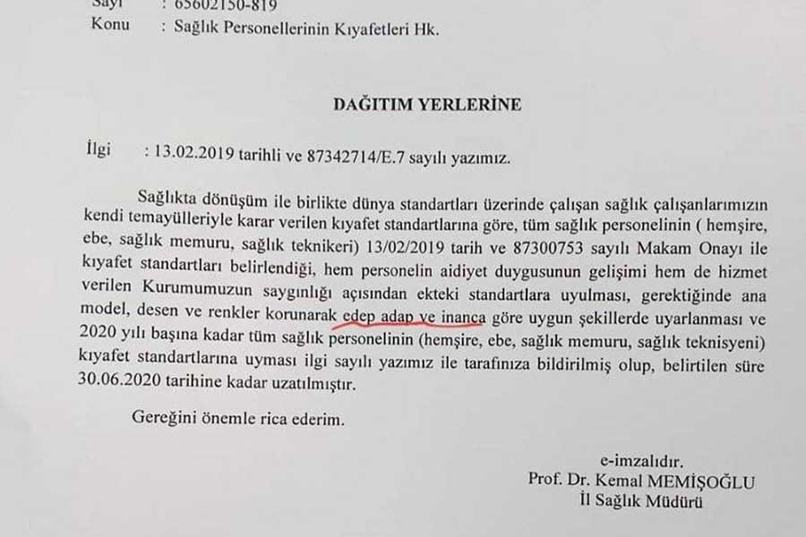 İstanbul Valiliği İl Sağlık Müdürlüğü tarafından sağlık kurumlarına gönderilen sağlık personellerinin kıyafetleri hakkındaki yazıda sağlık personellerinin kıyafetlerinin “edep, adap ve inanca” göre uygun şekillerde uyarlanması istendi.