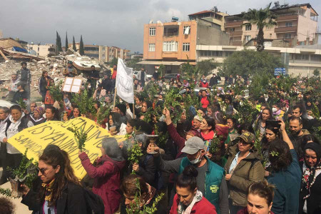 Depremin büyük yıkıma neden olduğu Hatay’ın Samandağ ilçesinde kadınlar, hayatını kaybedenleri anmak üzere 40. gün yürüyüşü düzenledi. “Hüznümüz isyanımızdır” pankartı taşınan yürüyüşte kadınlar ellerinde reyhan ve bahur dalları taşıdı.