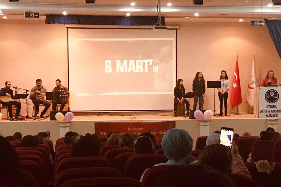 İstanbul Eğitim Araştırma Hastanesi’nde çalışan işçi ve emekçi kadınlar, 8 Mart Dünya Emekçi Kadınlar Günü’nü hastanede düzenledikleri etkinlikle kutladı. SES, Sağlık-Sen, Türk Sağlık-Sen ve Öz Sağlık-İş temsilcilerinin ortak çağrısıyla bir araya gelen kadınlar, şarkılar söyledi, şiirler okudu, 8 Mart’ın tarihçesini anlatan ve hastanede çalışan kadınların mesajlarıyla hazırlanmış videolar izlendi.