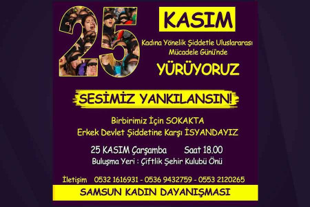 25 Kasım Kadına Yönelik Şiddete Karşı Uluslararası Mücadele ve Dayanışma Günü’nde sokağa çıkacak olan Samsun Kadın Dayanışması, tüm kadınları sesine ses katmaya çağırıyor.