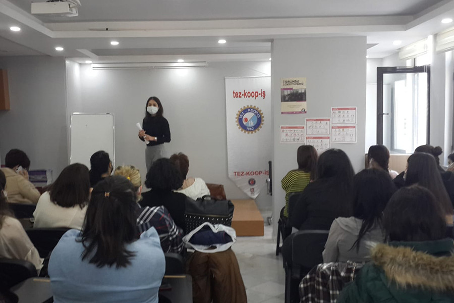 Sunumların ardından yapılan söyleşide konuşan kadın işçiler, çalışma koşullarının ağırlığı ve yeterince alınmayan önlemler nedeniyle kadın işçilerin yarısının Kovid-19’a yakalandığını ve bazılarının hastalığın ağırlaştığı dönemlerde ambulans hizmetine erişemediklerini belittiler. Sokağa çıkma yasaklarının olduğu günlerde bile kesintisiz çalışan market işçileri kendilerinin ne zaman aşılanacakları konusunda kaygılı olduklarını dile getirdi. Marketlerde kasiyer olarak çalışan işçiler müşterilerle temas etmek zorunda olduklarını ve akşam eve döndüklerinde ailelerini enfekte edebilecekleri konusunda çok korktuklarını belirttiler.