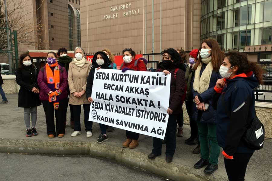 Avcılar Kadın Platformu üyesi kadınlar Bakırköy Adliyesi önünde ellerinde “Seda Kurt’un katili Ercan Akkaş hâlâ sokakta! Seda için adalet istiyoruz” yazılı pankart ile kadın cinayetlerinin son bulmasını istedi.