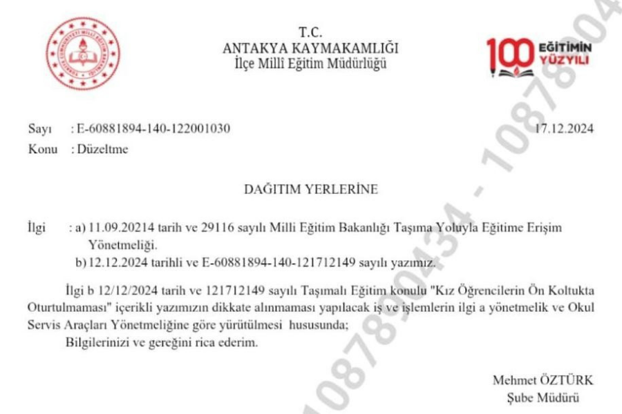 Şube Müdürü Mehmet Öztürk imzasıyla yeniden okullara iletilen yazıyla 12.12.2024 tarihinde iletilen ‘Kız öğrencilerin ön koltukta oturtulması’ içerikli yazının dikkate alınmaması istendi. 17.12.2024 tarihli yazıda, yapılacak iş ve işlemlerin Okul Servis Yönetmeliği’ne göre yürütülmesi istendi.