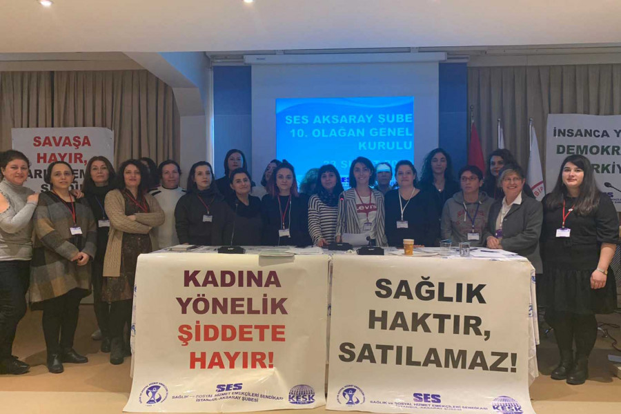 SES Aksaray Şube Genel Kurulu’nda kadınlar yeni döneme girerken basın toplantısı yaparak dinci, milliyetçi, cinsiyetçi politikaların kadınların hayatlarını her gün daha da zorlaştırdığına dikkat çekti. Yeni dönemde kadınlarla birlikte mücadeleyi büyüteceklerinin sözünü veren sağlık emekçisi kadınlar, bu birlikteliği büyütmek için tüm kadınlara da çağrı yaptı.