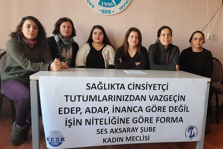 Sağlık ve Sosyal Hizmet Emekçileri Sendikası (SES) Aksaray Şubesi Kadın Meclisi, İstanbul İl Sağlık Müdürlüğü tarafından hastanelerde uygulanmak üzere yapılan kılık kıyafet düzenlemesine tepki göstermek amacıyla şube binasında basın toplantısı düzenledi. Açıklamada, “Sağlıkta cinsiyetçi tutumlarınızdan vazgeçin. Edep, adap, inanca göre değil işin niteliğine göre forma” pankartı asıldı. SES Aksaray Şube Sekreteri Emine Atar basın açıklamasını gerçekleştirdi. Atar, İstanbul Sağlık Müdürlüğünün 31 Aralık 2019 tarihinde yolladığı kılık kıyafet genelgesinde yer alan "edep, adap ve inanca uygun" ibaresi sağlık çalışanlarını, özellikle kadınları hedef aldığını vurguladı.