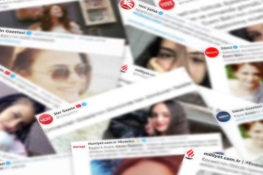 Raporda “Kemalist sol medyayı temsil eden Cumhuriyet, Sözcü ve BirGün; seküler merkez medyayı kapsayan Hürriyet, Milliyet, Habertürk ve sağ muhafazakar siyasi görüşe yakın olan Sabah, Star ve Yeni Şafak” gazetelerinde 2018’de gerçekleşmiş fakat süreci 2019’da da devam eden ve 2019’da işlenen kadın cinayetlerinden medyada en çok yer edinenlerden örnekler seçildi. Örneklemde yer alan isimler ve cinayetlerin işlenme tarihleri ise şöyle: “Ecem Balcı (5 Ocak 2018), Şule Çet (1 Haziran 2018), Emine Bulut (18 Ağustos 2019), Güleda Cankel (20 Kasım 2019), Ceren Özdemir (3 Aralık 2019)”
