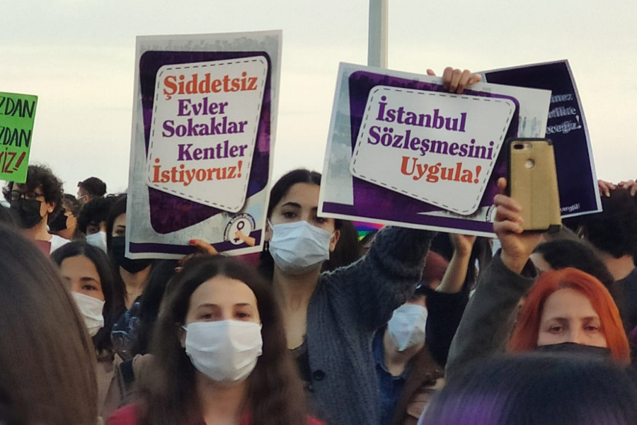 - “Kadına yönelik şiddete, ayrımcılığa karşı toplumsal cinsiyet eşitliğini savunan ulusal ve uluslararası hukuksal, kamusal kazanımlarımız, başta İstanbul Sözleşmesi olmak üzere hem ülkemizde hem de dünyada eril iktidarlar tarafından saldırı altında. AKP iktidarı tarafından kadını erkeğe bağlı tutmak için yapılan kazanımlarımızı geri alma girişimleri sürekli gündemde tutulmaktadır. Geçtiğimiz günlerde gece yarısı Cumhurbaşkanlığı kararnamesi ile İstanbul Sözleşmesi feshedilmeye kalkışıldı. Biz kadınlar hukuken geçerliliğinin olmadığını bildiğimiz bu kararı tanımadığımızı her alanda haykırdık.”