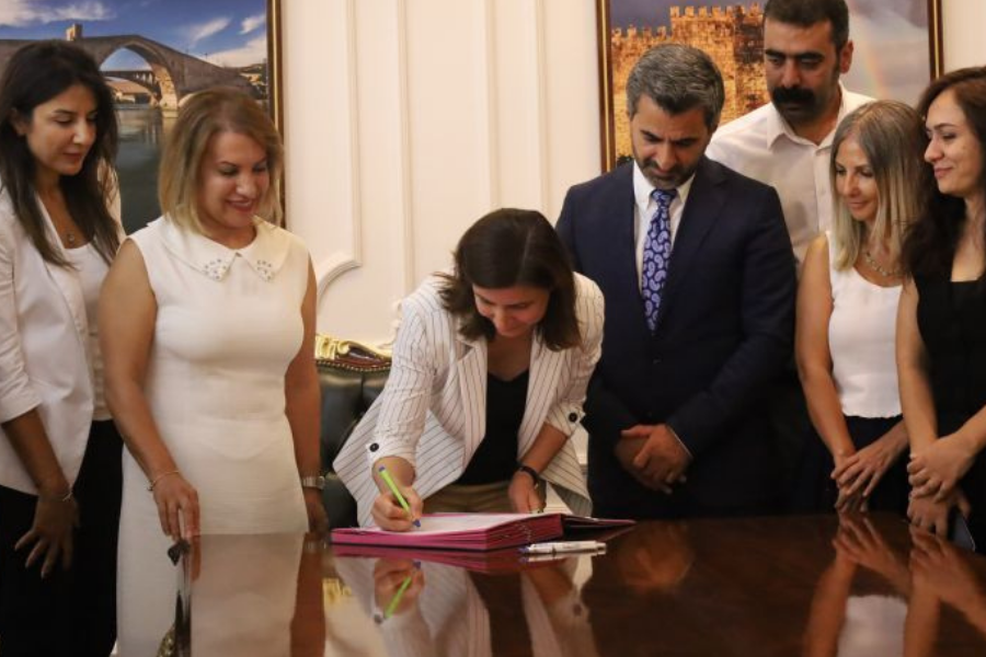 Diyarbakır Büyükşehir Belediyesinde gerçekleştirilen imza törenine Diyarbakır Büyükşehir Eşbaşkanları Serra Bucak ve Doğan Hatun, Büyükşehir Belediye Meclisi Kadın Komisyonu üyeleri, Diyarbakır Baro Başkanı Nahit Eren ve Kadın Hakları Merkezi üyeleri de katıldı.