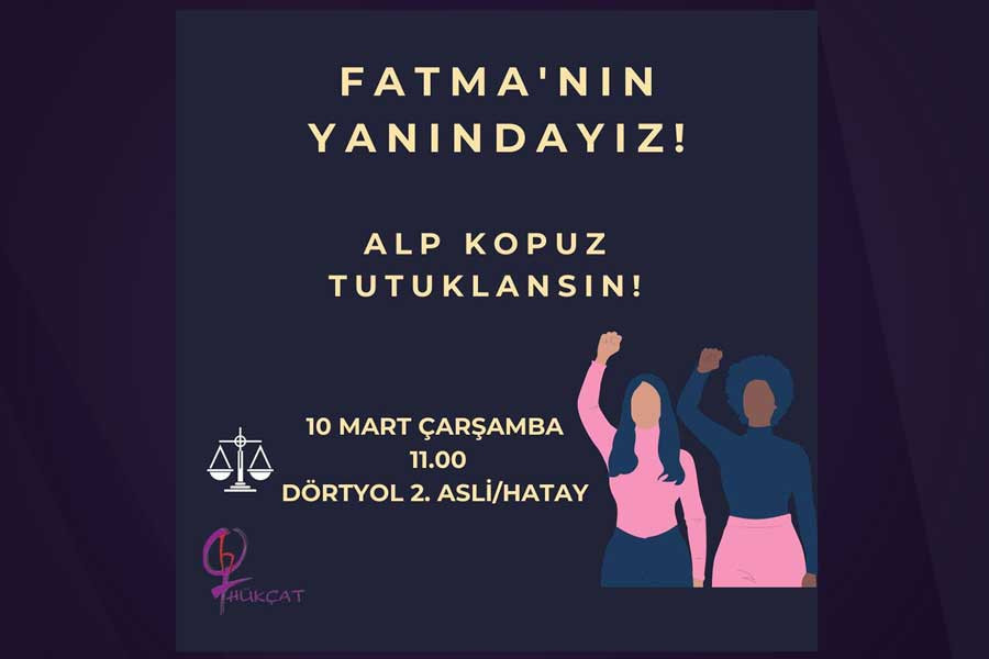 Hacettepe Üniversitesi öğrencisi Fatma A.’nın AKP’li üst düzey bir bürokratın oğlu tarafından aylarca evinde hapsedilerek uğradığı şiddet ve tacizi yaptığımız haberlerle daha önce duyurmuştuk. Fatma’nın adalet mücadelesinde ilk duruşma 10 Mart Çarşamba günü saat:11.00’de Hatay Dörtyol 2. Asli Mahkemesinde görülecek. Davanın takipçisi olacaklarını duyuran Hacettepe Üniversitesi Kadın Çalışmaları Topluluğu (HÜKÇAT) Fatma’nın ilk duruşmasına katılım çağrısı yapıyor. Fatma ile dayanışma çağrısı yapan ve yalnız bırakmayacaklarını söyleyen üniversiteli kadınlar, herkesi Fatma’nın adalet mücadelesine destek olmaya çağırıyor.