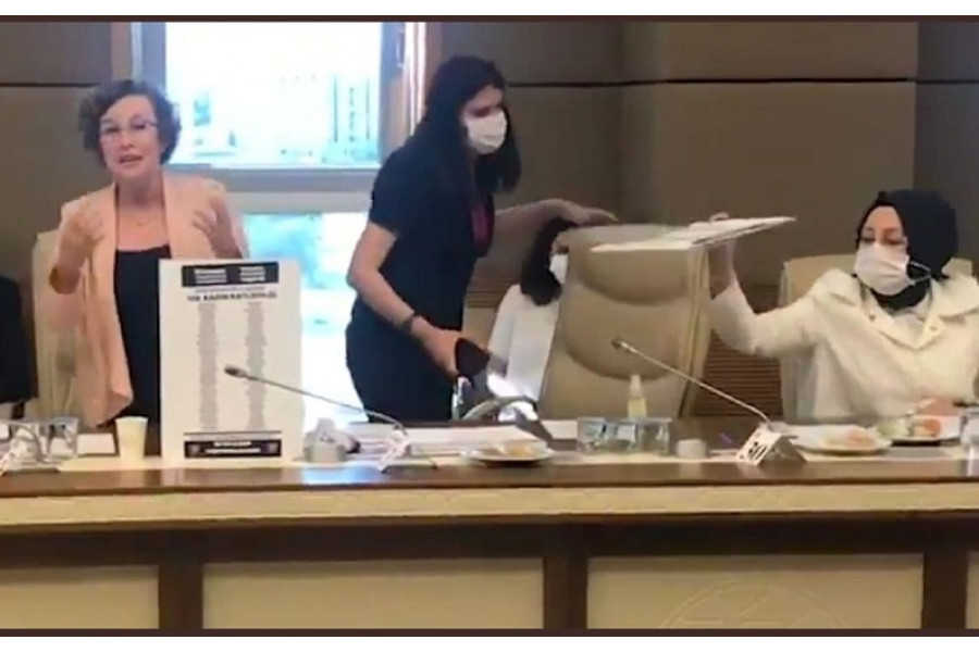 Milletvekilleri Filiz Kerestecioğlu ve Semra Güzel toplantıyı terk ederken, son dört ay içinde ölen kadınların isimlerin olduğu dövizi masaya bıraktılar. Hemen yanlarında oturan AKP Tekirdağ Milletvekili Çiğdem Koncagül öfkeyle izliyordu. Dövizi masadan aldı öfkeyle, Semra Güzel orada alıp kalktığı koltuğa koydu, oradan da aldı, görünmez hale getirdi. Görüntüleri izleyin, basında yer aldı.