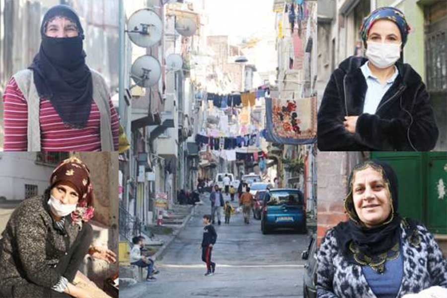 Mahalleye girdiğinizde göze çarpan ilk şey camdan cama asılan çamaşırlar. Her sokağın başında çocuklar otururken, kadınlar da bir araya gelmiş iftar için hazırlıklarını yapıyor. Mikrofon uzattığımız kadınların ortak tepkisi “yoksulluk” ve hükümetin politikaları. Pandemi nedeniyle çoğu kişinin işten çıkarıldığını belirten kadınlar, ev içinde çalışmanın yanı sıra mutfak giderlerini ve hanenin ihtiyaçlarını da karşılamak zorunda kalıyor. Geçen günlerde Urfa ve Diyarbakır’da yurttaşlara dağıtılan patates ve soğan sırasında izdiham yaşanması da kadınların gündeminde. Kadınlar, “Biz soğan, patates ve makarna istemiyoruz” diye hükümetin politikalarını eleştiriyor.