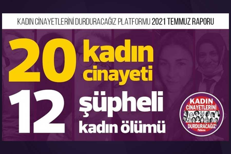 Kadın Cinayetlerini Durduracağız Platformu (KCDP), kadına yönelik şiddet çetelesinin temmuz ayı raporunu yayımladı. Rapora göre, temmuz ayında 20 kadın katledildi, 12 kadın ise şüpheli bir şekilde yaşamını yitirdi. Rapora göre, hayatını kaybeden 20 kadının 10’u evli olduğu erkek, 2’si birlikte olduğu erkek, 2’si tanıdık, 1’i baba, 1’i akraba, 1’i eskiden birlikte olduğu erkek, 1’i oğlu, 1’i ısrarlı takipçi olan erkek tarafından katledildi, 1 kadının fail ile olan yakınlığı tespit edilemedi.