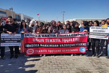 Sendikalaştıkları için işten atılan Uğur Tekstil işçisi iki kadın yazdıkları mektuplarla seslendi: Haksızlığa uğrayan biziz, yasaları çiğneyen patron. Karşımızda bu kadar jandarma, polis neden var!