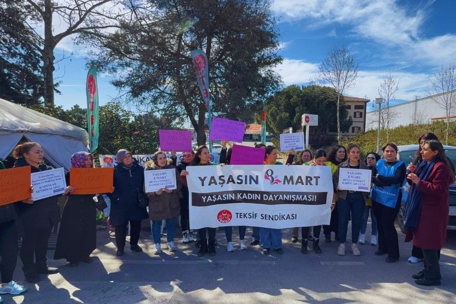 Açıklamada, “Yaşasın 8 Mart, yaşasın kadın dayanışması”, “Yaşasın örgütlü mücadelemiz”, “TKIS işçisi direnişin simgesi”, “İnsanca yaşam istiyoruz”, “Sendika, sigorta, 7 saat iş günü”, “Sendikal hakkımız engellenemez” sloganları atıldı.
