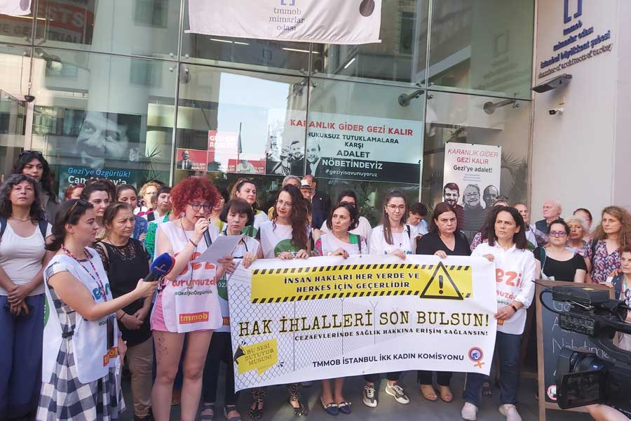 Eren Keskin’le yaptığı görüşmenin ardından Mücella Yapıcı’nın mücadelesinin duyulduğunu belirten Top, “Bu akşam cezaevlerindeki tutukluların, cezaevi yönetimlerinin, burada meslek ahlakını hiçe sayan sağlık çalışanlarının keyfi uygulamaları ile sağlık hakkına erişmesi engellenen tutsakların sesi olmak için bir araya geldik. Meslektaşımız, yol arkadaşımız Gezi Parkı Direnişi tutuklusu Mücella Yapıcı da bu kişilerden birisi. Diş doktoruna giderken kelepçesi çıkarılmadığı ve devletin neredeyse sıradanlaşmış bu insan hakkı ihlaline karşı, kendisi gibi sağlık hakkına erişilmesi engellenen tutsaklar için hastaneye gitmeyi reddediyor. Beraat etmelerine rağmen yeniden açılan Gezi Davasıyla tutsak edilen yol arkadaşlarımız ne yazık ki 422 gündür kaldıkları cezaevinde de yine hukuka ve insan haklarına aykırı keyfi uygulamalara maruz bırakılıyor. Dahası iktidarın elindeki medya ile hemen her gün Gezi tutsaklarına dönük asılsız karalama kampanyaları, kötü bile denemeyecek senaryoları ile meşruluğu sorgulanamayacak Gezi direnişine saldırıyor. TMMOB İstanbul İKK Kadın Komisyonu olarak biz de Gezi tutuklusu yol arkadaşımızın tüm hasta tutsaklar özelinde başlattığı bu politik direnişe ses vermek için 422. adalet nöbetinde hep birlikteyiz” dedi.