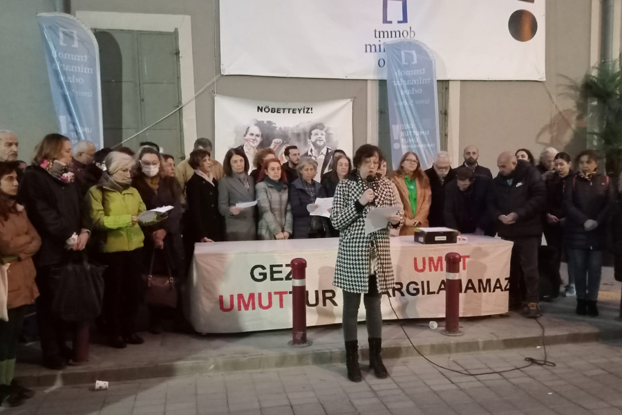 TMMOB İzmir İl Koordinasyon Kurulu, İsmailağa Cemaatine bağlı Hiranur Vakfında 6 yaşındaki çocuğun evlendirilmesine ilişkin Mimarlar Odası İzmir Şubesi önünde basın açıklaması gerçekleştirdi. Basın metnini TMMOB Yönetim Kurulu Üyesi Ela Esen İnan okudu.