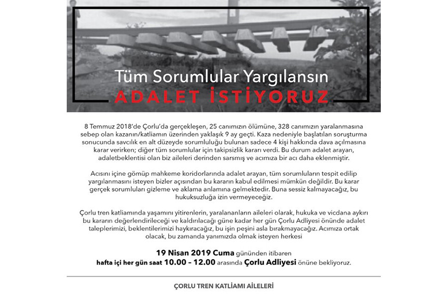 Tekirdağ’ın Çorlu ilçesinde 8 Temmuz 2018’de 25 kişinin hayatını kaybettiği, 328 kişinin yaralandığı kazada yalnızca 4 kişi hakkında dava açılmasına ve esas sorumlular hakkında bir şey yapılmamasına karşı aileler Çorlu Adliyesi önünde bugünden itibaren adalet nöbeti tuttu..
