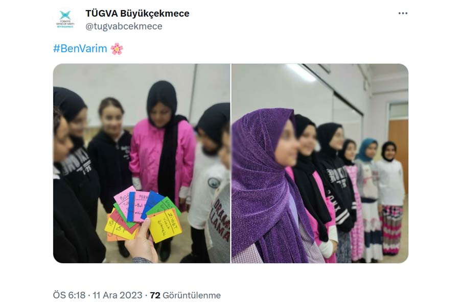 Söz konusu temsilciliğin sosyal medya hesaplarında paylaşılan görüntülerde MEB’e bağlı bir okulda 11 Aralık 2023 tarihinde yapılan etkinlikte öğrencilere tesettür anlatıldığı ve birçok çocuğun tesettüre sokulduğu görüldü. Söz konusu etkinlik kapsamında paylaşılan görüntüler ise sosyal medya hesaplarında “Ben Varım projesinin 3. haftasında konumuz tesettürdü. ‘Başımızın üstünde yerin var tesettür’ dedik ve vakıf okulu öğrencilerimiz ile tesettürün önemine dair konuştuk. Konu başlığı tesettür olan tabu kartları hazırladık ve bir günlerini tesettürlü bir şekilde geçirmelerine vesile olduk” ifadeleriyle paylaşıldı.