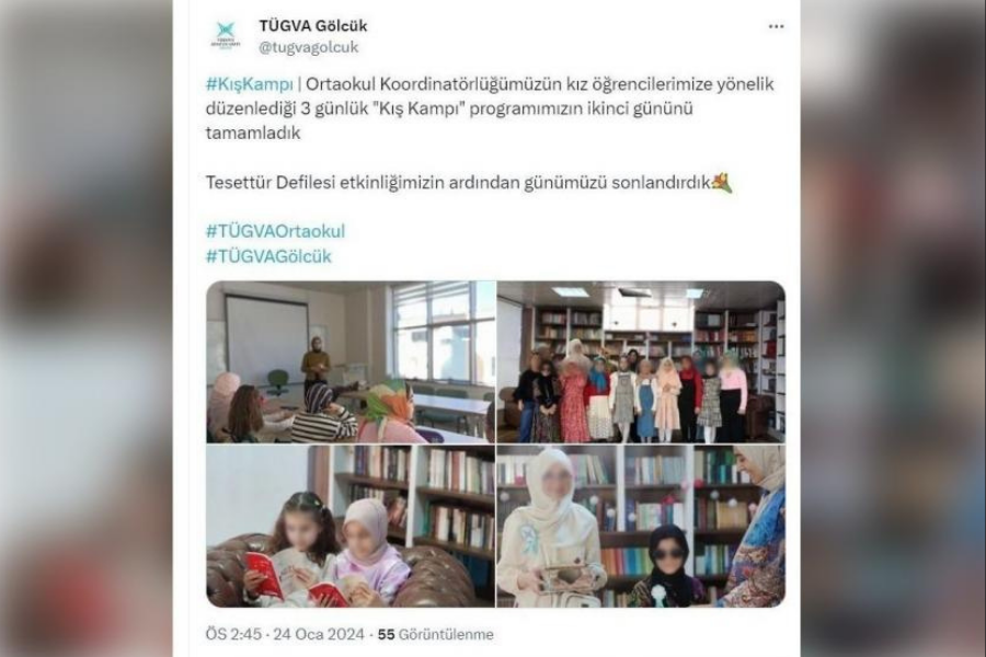Çocukların tesettürlü fotoğraflarının paylaşıldığı TÜGVA Gölcük İlçe Temsilciliği’nin sosyal medya hesabında etkinlik şu ifadelerle duyuruldu: “Ortaokul Koordinatörlüğümüzün kız öğrencilerimize yönelik düzenlediği 3 günlük ‘Kış Kampı’ programımızın ikinci gününü tamamladık. Tesettür Defilesi etkinliğimizin ardından günümüzü sonlandırdık.”