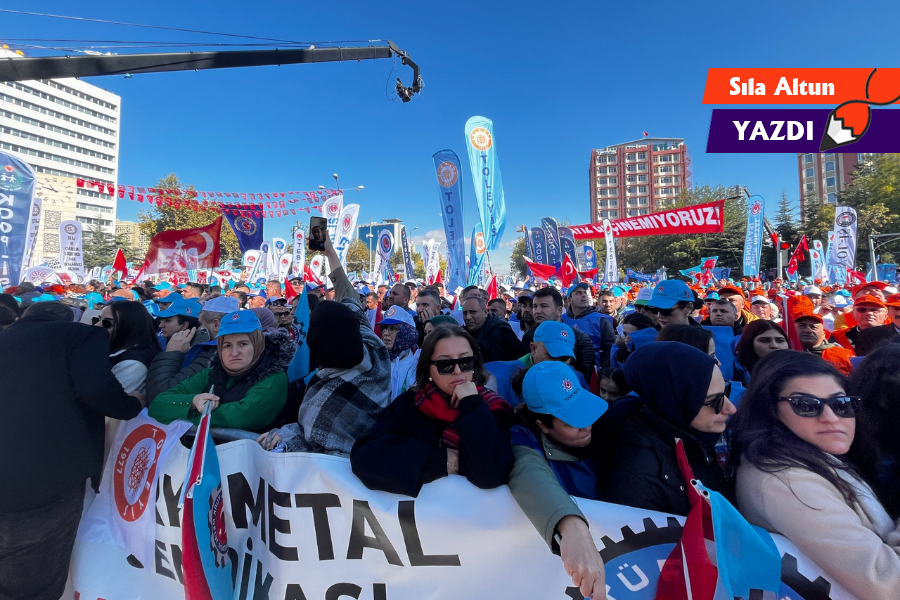 Miting alanında en çok gözüme çarpan şey, adım başı bir grup metal işçisine rastlıyor olmaktı. Genç metal işçisi kadınlar kalabalığın içinde dururken görece daha yaşlı olanlar kalabalıktan uzakta mitinge giriş noktasında toplanıyorlardı. 25 yaşında Ford’da çalışan bir metal işçisi kadına denk geldik. Sohbet etmeye başladık. Önce en kalabalık sendikalardan biri olduklarını söyleyerek hafifçe övündü sendikasıyla. Aşağı yukarı 35-40 bin lira aldığını ve vergi kesintisi gerçekleştiğinde bu ücretin 25 bin liraya kadar gerilediğini söyledi. Ücretlerdeki bu düşüşle kendi ihtiyaçlarını dahi karşılamakta zorlandığını ifade etti ve üzerindeki montu göstererek “Kış geliyor. Bir mont bile kaç lira olmuş, alamıyoruz” dedi. Tek başına yaşayıp yaşamadığını sordum. Sonuçta karşımdaki 25 yaşında genç bir kadın işçiydi, kendisi için bir hayat kurup kuramadığını merak ediyordum. Hâlâ ailesiyle yaşadığını, bu koşullarda ayrı bir eve çıkmanın kendisi için mümkün olmadığını söyledi.