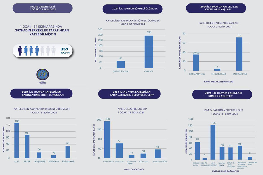 Türkiye Kadın Dernekleri Federasyonu’nun raporuna göre, 1 Ocak - 31 Ekim tarihleri arasında 357 kadın erkekler tarafından öldürüldü.