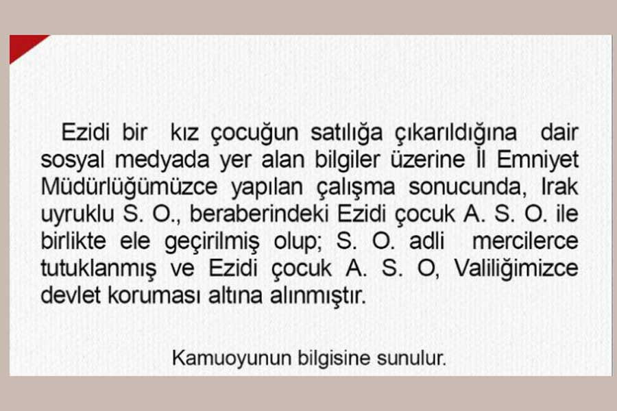 “Bakanlık, Ezidi kız çocuğunu satılığa çıkaran S.O.’nun gözaltına alındığını, çocuğun ise ‘çocuğun üstün yararı düşünülerek’ örselenmemesi adına tedbir amaçlı korumaya alındığını söyledi. Ankara Valiliği ise zanlının tutuklandığını açıkladı. Açıklamaların sadece çelişkili olduğu değil gerçek dışı olduğu ortaya çıktı.