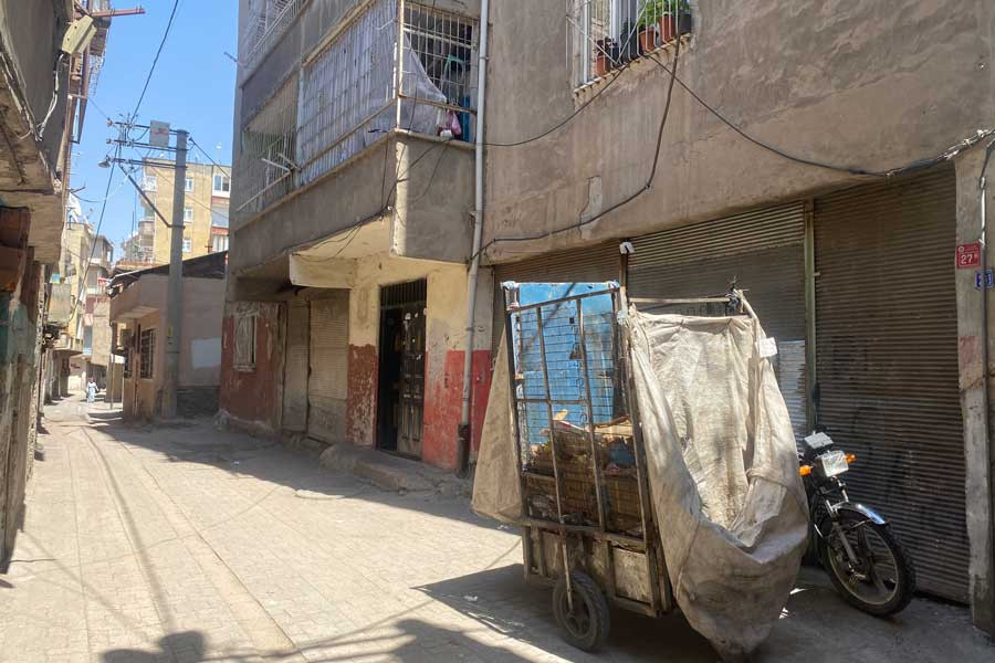 Maraş merkezli depremlerin Diyarbakır’da en çok hasara sebep olduğu ilçelerden ve Diyarbakır’da yoksulluğun en çok hissedildiği yerlerden biri olan Bağlar’dayız. Kaynartepe Mahallesi’nde depremin verdiği hasar, dışarıdan baktığınızda pek anlaşılmıyor. Çünkü mahallede görebileceğiniz evlerin, gecekondu ve dükkanların çoğu adeta terk edilmiş depolar kadar eski. Yani Bağlar’da hangi eve dönüp baksanız, sadece depremin verdiği yorgunluk değil, yoksulluğun da yorgunluğunu hissedebilirsiniz.