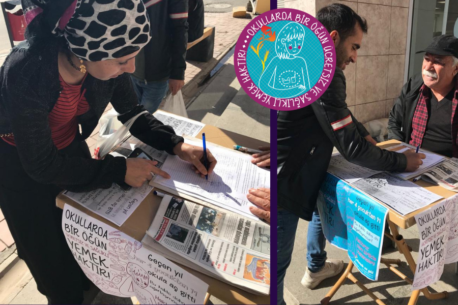 Ekmek ve Gül’ün başlattığı okullarda her çocuğa 1 ögün ücretsiz, sağlıklı yemek kampanyası çalışmaları sürüyor. İzmir Torbalı’da Ekmek ve Gül okuru kadınlar yaşadıkları mahallelerde kapı kapı dolaşarak imza topladı. İlçe merkezi olan Tepeköy Merkezde de stant açtı.