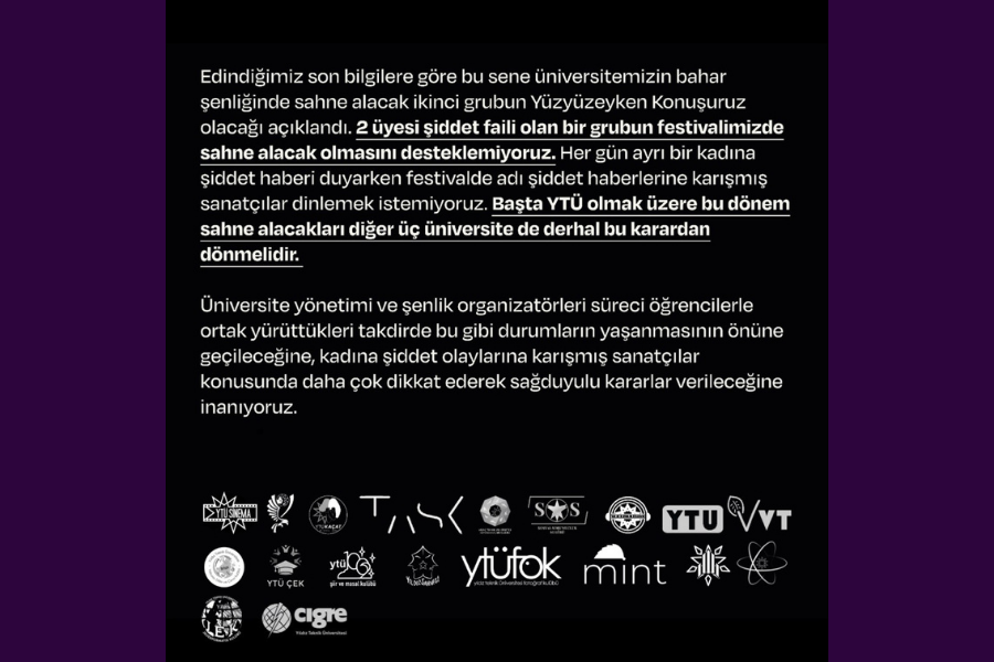 "Edindiğimiz son bilgilere göre bu sene üniversitemizin bahar şenliğinde sahne alacak ikinci grubun Yüzyüzeyken Konuşuruz olacağı açıklandı. 2 üyesi şiddet faili olan bir grubun festivalimizde sahne alacak olmasını desteklemiyoruz. Her gün ayrı bir kadına şiddet haberi duyarken festivalde adı şiddet haberlerine karışmış sanatçılar dinlemek istemiyoruz. Başta YTÜ olmak üzere bu dönem sahne alacakları diğer üç üniversite de derhal bu karardan dönmelidir.