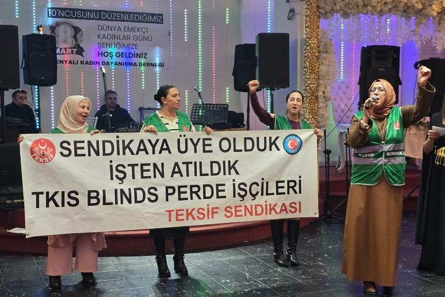 Halaylarla süren buluşmaya TKIS Blinds fabrikasında TEKSİF'te sendikalaştıkları için işten çıkartılan ve yüz günü aşkındır organize sanayi bölgesi önünde direnişte olan kadın işçiler de katıldı. İşçiler, etkinliğin yapıldığı salona sloganlarla giriş yaptı. TKIS Blinds'ta işten çıkarılan işçilerden Sema, "TKIS Blinds işçileri olarak sendikaya üye olduk. Anayasa’nın bize vermiş olduğu hakkı kullandık. On arkadaşımla birlikte işten atıldık. 130 gündür serbest bölge kapısı önünde direniyoruz. Fabrikada çalışan sendikalı arkadaşlarımız çeşitli baskılara maruz kalıyorlar. Ancak biz kazanacağımıza inanıyoruz" dedi.