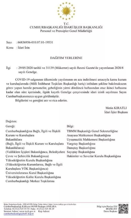 29 Mayıs 2020 tarihli 2020/8 sayılı Cumhurbaşkanı genelgesine dayanılarak kamu kurum ve kuruluşlarında görev yapan hamile personelin -istihdam şekline bakılmaksızın- hamileliğin 24. haftasından 32. haftasına kadar idari (yani ücretli) izinli sayılması uygun görüldü.