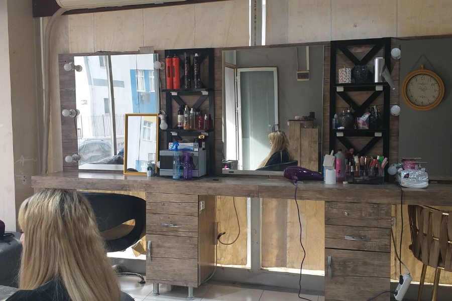 “Dükkanda mı yaşıyorsun?” sorumuza paravanı gösterip yanıtlıyor: “Arkasında yatak, dolap, mutfak var. Bir de kızımın masası var. Orada kızımla birlikte yaşıyoruz.” Bunları o kadar sakin anlatıyordu ki kuaför dükkanında olduğumuzu unutmuş, Çağla’nın evine kahve içmeye gitmiş gibiydik.