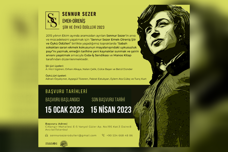 7 Ekim 2015 tarihinde yaşamını yitiren şiirin ve umudun yorulmaz iğnesi Sennur Sezer’in anısı ve mücadelesini yaşatmak adına DİSK Gıda-İş Sendikası ve Manos Kitap tarafından düzenlenen Sennur Sezer Emek-Direniş Şiir ve Öykü Ödülleri için başvurular başladı. Eserler, 15 Nisan 2023 tarihine kadar gönderilebilecek.