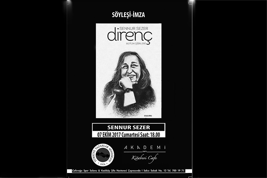 7 Ekim 2015’te yitirdiğimiz Usta Şair Sennur Sezer’in bütün şiir kitaplarını ve kitaplarında yer almayan 28 şiirini içeren kitabı “Direnç” Manos Kitap tarafından yayımlandı. Özel ciltli, 488 sayfalık kitap, ilk kez bu etkinlikte okur ile buluşacak. Usta şairin kitaplarına girmeyen 28 şiirinin de yer aldığı kitap, Türkan Şoray’a ait olduğu sanılan “Buruk Acı”yı da şairi ile buluşturuyor. “Buruk Acı” şarkısının sözleri ilk defa bir Sennur Sezer kitabında yer alıyor.İlgili haberler