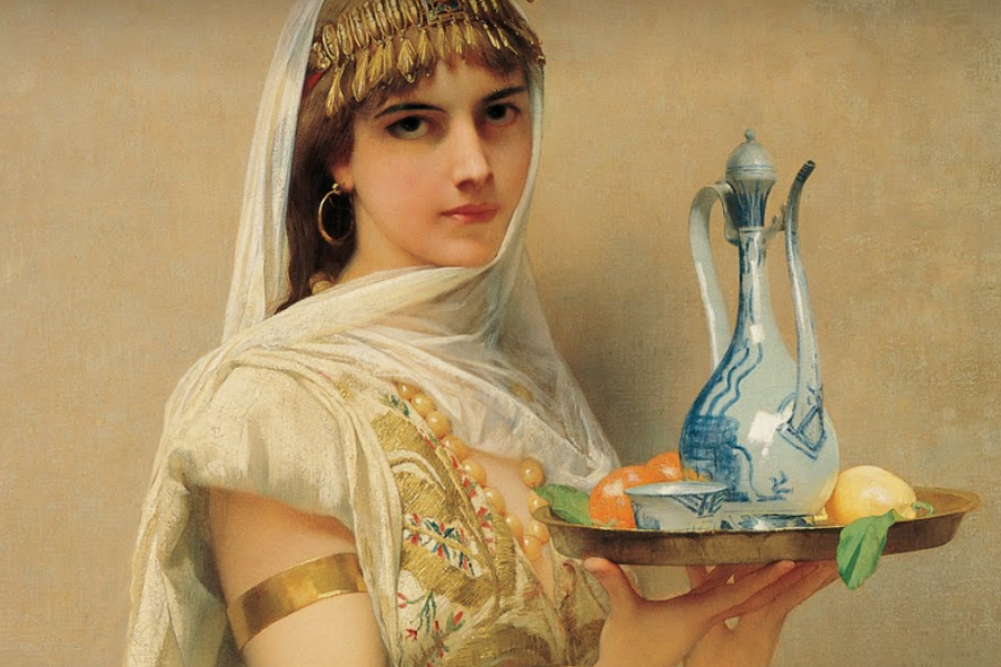Lefebvre’in bu tablosunda alt bölümü bitkisel motifli çinilerle bezeli bir duvar önünde poz veren bir genç kadın görülür. Önü işlemeli beyaz giysiler içindeki kadının taşıdığı tepsi içinde mavi-beyaz porselen bir sürahi ve fincan resmedilmiş.