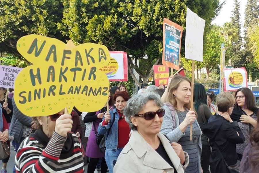 Çekin elinizi haklarımızdan ve hayatlarımızdan, biz kadınlar insanca yaşamak ve yaşatmak istiyoruz. Nafaka hakkımızı savunuyoruz, kadınların ve çocukların nafakası artırılsın istiyoruz!