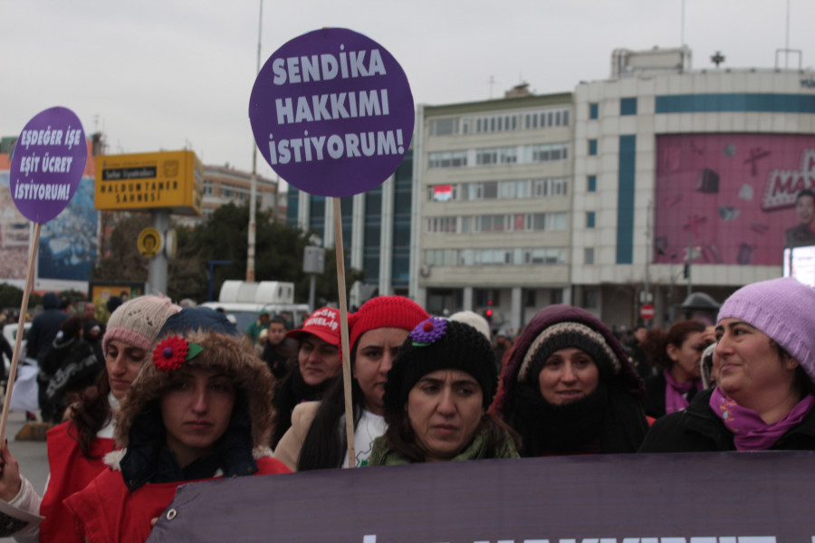 İşimizi geri istiyoruz. Ekonominin zor olduğu bugünlerde iş bulmak kolay değil. Var olduğumuz fabrikalarda, kötü çalışma koşullarına kadınlar olarak mahkum değiliz. Sendika haktır engellenemez.